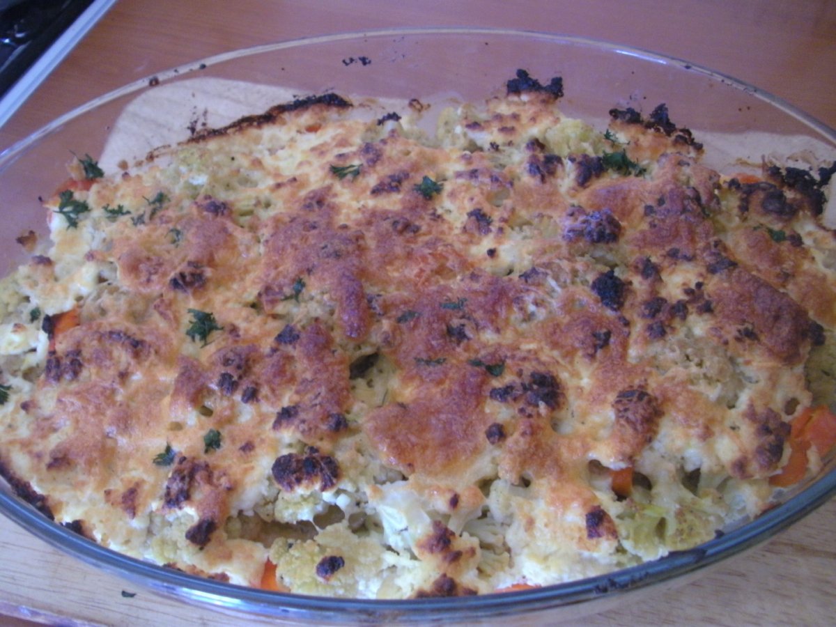 Punem conopida rupta buchetele intr-o oala cu un pic de sare si o lasam 10 minute, apoi o clatim bine si o punem la fiert in apa cu un varf cutit de sare, cca 15 min la foc moderat, impreuna cu morcovul, iar cand e gata o scurgem de apa si o asezam in tava unsa cu un pic ulei.Taiem morcovul felii si ardeiul crud si le asezam printre conopida.