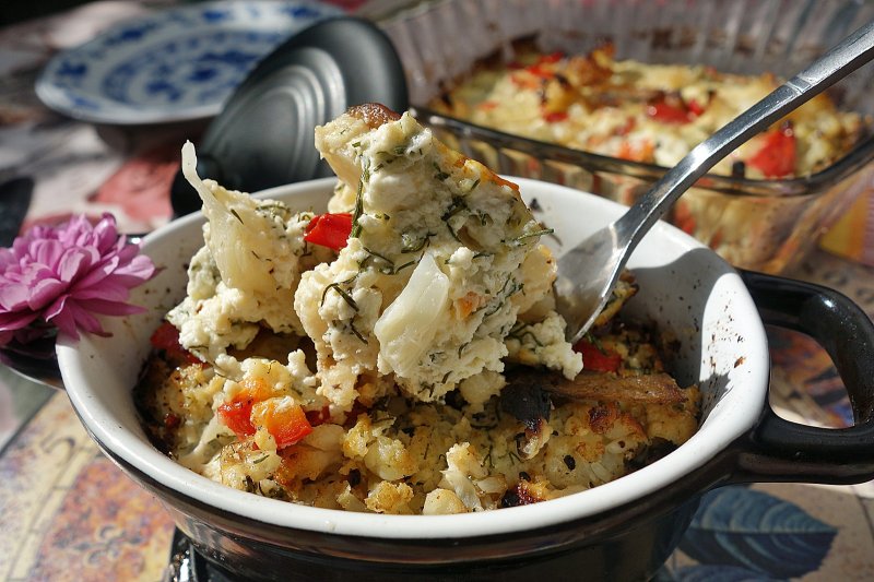 Intr-o tava mai inalta punem conopida si ciupercile, adaugam si ardeiul taiat cubulete mici. Batem ouale impreuna cu smantana si branza de vaci, saram si piperam dupa gust, adaugam si mararul verde taiat fin si turnam acest amestec peste legume.