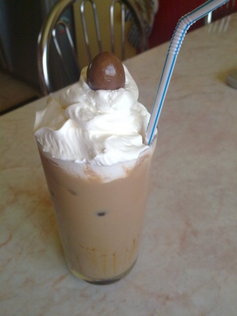 Se iau cuburile de gheata si se pun in pahar, iar apoi se toarna restul de lapte rece deasupra.Adaugam si scupele de inghetata, ornam cu frisca si asezam bomboana de ciocolata.