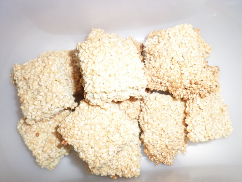 Se incalzeste cuptorul la 180 de grade. Se tapeteaza tava cuptorului cu hartie de copt si se unge cu putin ulei se intinde compozitia pe foaia unsa cat mai subtire si se coace 10 minute. Se scoate din cuptor si se taie romburi sau patrate se lasa pe foaie si se coace inca 10 minute pana se auresc usor. Nu trebuie mult, caci susanul se face amar daca-i prea maro.