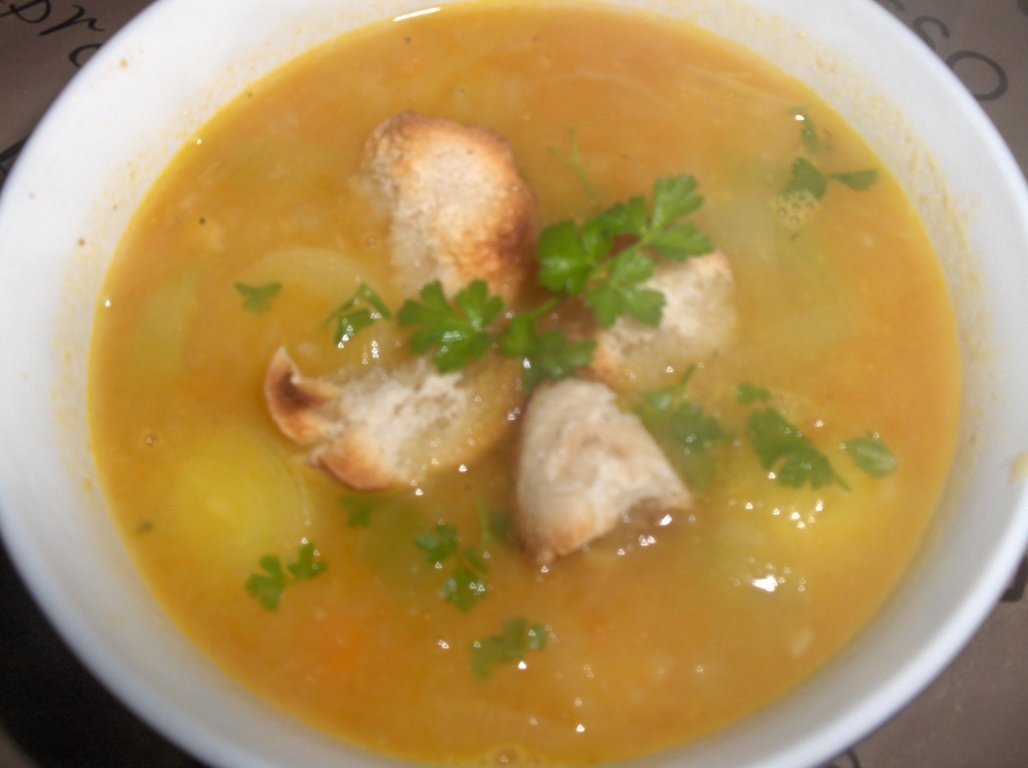 4) Se pune din nou pe foc, se adaugã prazul tãiat rondele si se lasã la fiert încã 5 min. La urmã se pune pãtrunjelul tocat.