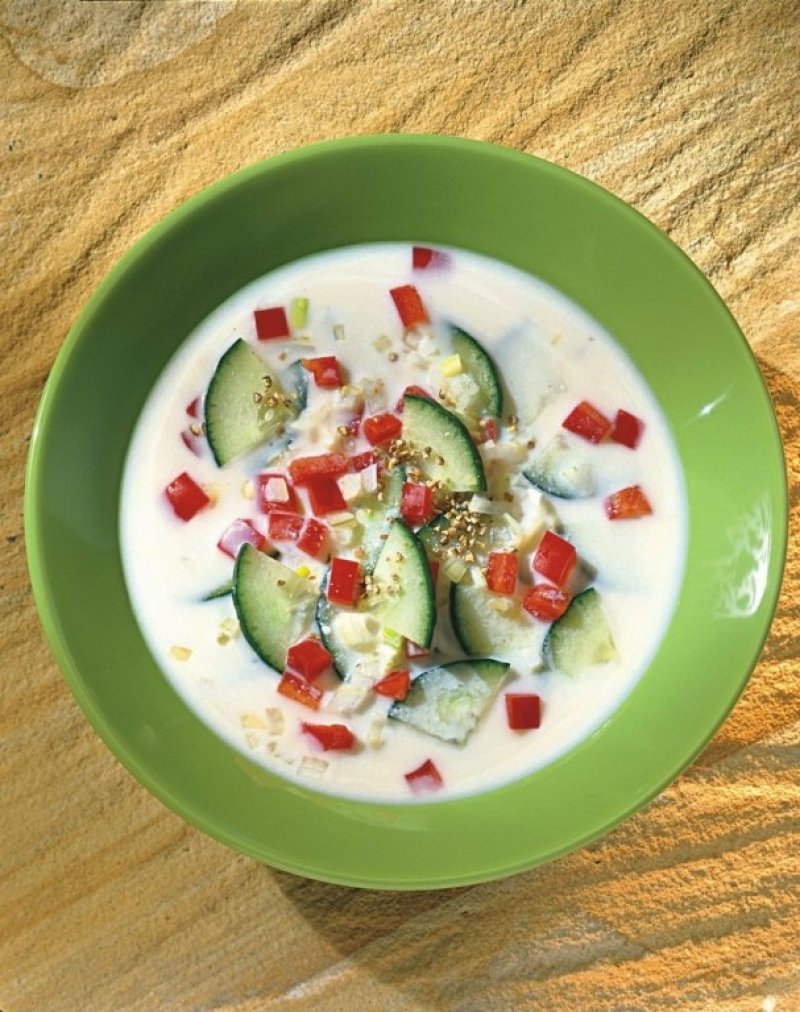 Taiem castravetii marunt sau ii dam pe razatoarea mare, acoperim cu sare si ii lasam la rece pentru vreo 30 de minute. Intre timp facem o crema din usturoiul pisat, nucile prajite si maruntite, ulei, iaurt, smantana, sare si piper. Stoarcem castravetii de lichidul lasat si amestecam cu sosul de lactate, asezonand cu marar, cimbru si ardeiul taiat cubulete.