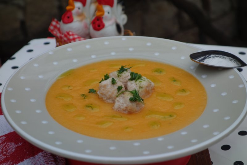 Se curata zarzavaturile de coaja, se spala si se taie cubulete, apoi se pun la fiert cu cana de supa de pui, adaugand apa, daca mai este nevoie, cat sa acopere zarzavatul, un praf de sare. Perisoarele se pregatesc, amestecand carnea cu galbenusul, un praf de sare, un pic de patrunjel tocat fin. Se adauga in supa, cand zarzavatul este aproape fiert. Dupa 10-15 minute, se opreste focul si se scurge cu grija supa, se scot perisoarele pe o farfuriuta. Se da la blender zarzavatul, iar piureul se subtiaza cu supa ramasa, pana ajunge la consistenta potrivita.