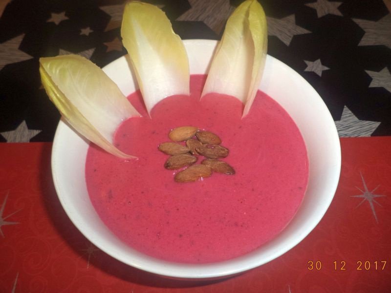 Intr-o oala incapatoare incingem putin ulei, punem prazul la calit pentru cateva minute, adaugam usturoiul si andivele, le calim 5 minute, apoi adaugam supa si lasam sa fiarba. Cand sunt legumele aproape fierte, adaugam si sfecla si mai lasam sa fiarba cateva minute, apoi luam supa de pe foc și o blenduim. Adaugam smantana, potrivim gustul de sare, piper si nucsoara. Migdalele le maruntim la robot si le adaugam in supa. Mai dam supa intr-un clocot apoi lasam un pic sa se racoreasca si servim. Pofta buna!