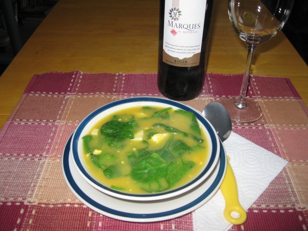 Curatam si spalam legumele dupa care le taiem in bucatele potrivite. Intr-o oala punem 3 linguri ulei de masline iar cand incepe sa friga punem usturoiul tocat marunt si il lasam pana isi schimba culoarea. Adaugam legumele, lasam 4-5min. la foc moderat amestecand mereu, adaugam cele 2 cuburi de supa concetrata si mai amestecam impreuna timp de 2min. Adaugam apa fierbinte sa treaca doua degete de legume, punem si cele 3 oua spalate si cu capacul pus fierbem timp de 20-25min. pana legumele sau inmuiat. Scoatem ouale si reducem totul la o crema cu blenderul. Adaugam in supa crema ouale decojite si taiate nu prea marunt, spanacul spalat, piper si sare daca mai e nevoie, amestecam si lasam sa mai fiarba cca.5min. Tragem oala de pe foc adaugam 1 lingura de ulei de masline amestecam si cu capacul pus lasam 10 min. sa odihneasca si sa se amestece aromele. Daca vreti putin mai lichida supa mai adaugati putina apa fierbinte. E o supa crema tipica din Portugalia ce se serveste mai ales seara la cina.