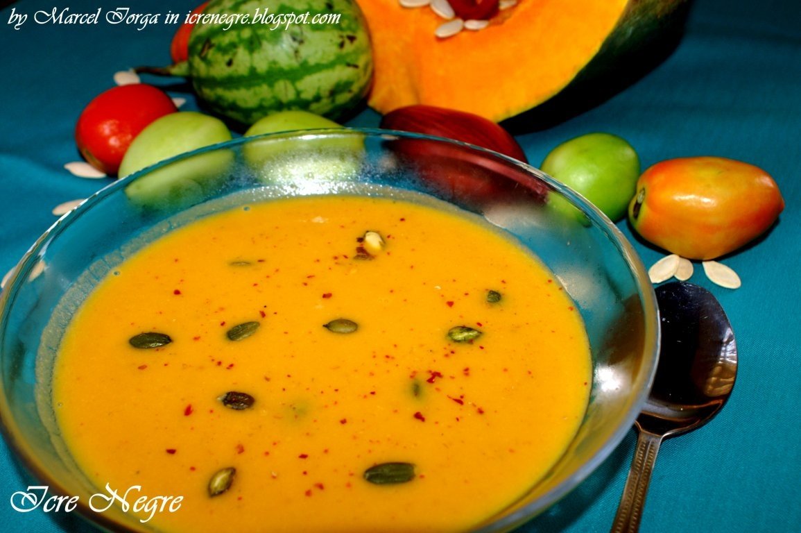 Adăugăm cuburile de dovleac copt şi adăugăm supa. Nu pe toată, mai oprim dacă avem nevoie să dăm consistenţa dorită unei supe creme.