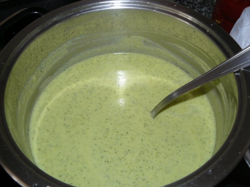 Se curata si se taie feliute usturoiul si ceapa. Se calesc in putin ulei. Se adauga dovleceii felii(fara sa fie curatati, doar spalati) si cartofii curatati, taiati felii. Se mai calesc putin, apoi se pune apa sa-i acopere bine si se fierb. Se pune vegeta, sare si piper. Cand sunt fierti,se adauga branza si se stinge focul, apoi se mixeaza . Se mai poate pune supa sau apa fiarta daca e prea gros.