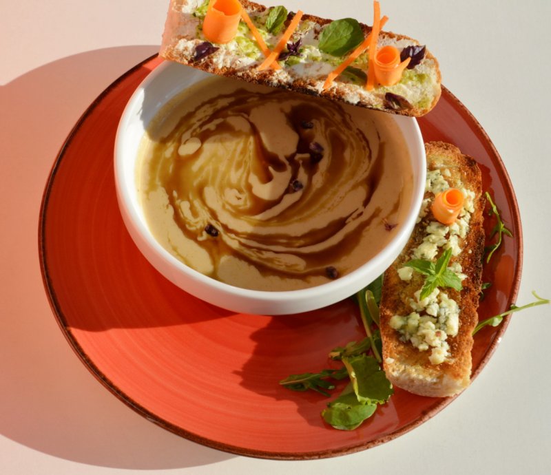 Se serveste supa calda, cu paine prajita sau bagheta, cu branza de capra si gorgonzola. Se potriveste foarte bine cu branzeturi. De cremozitate nu mai zic…
