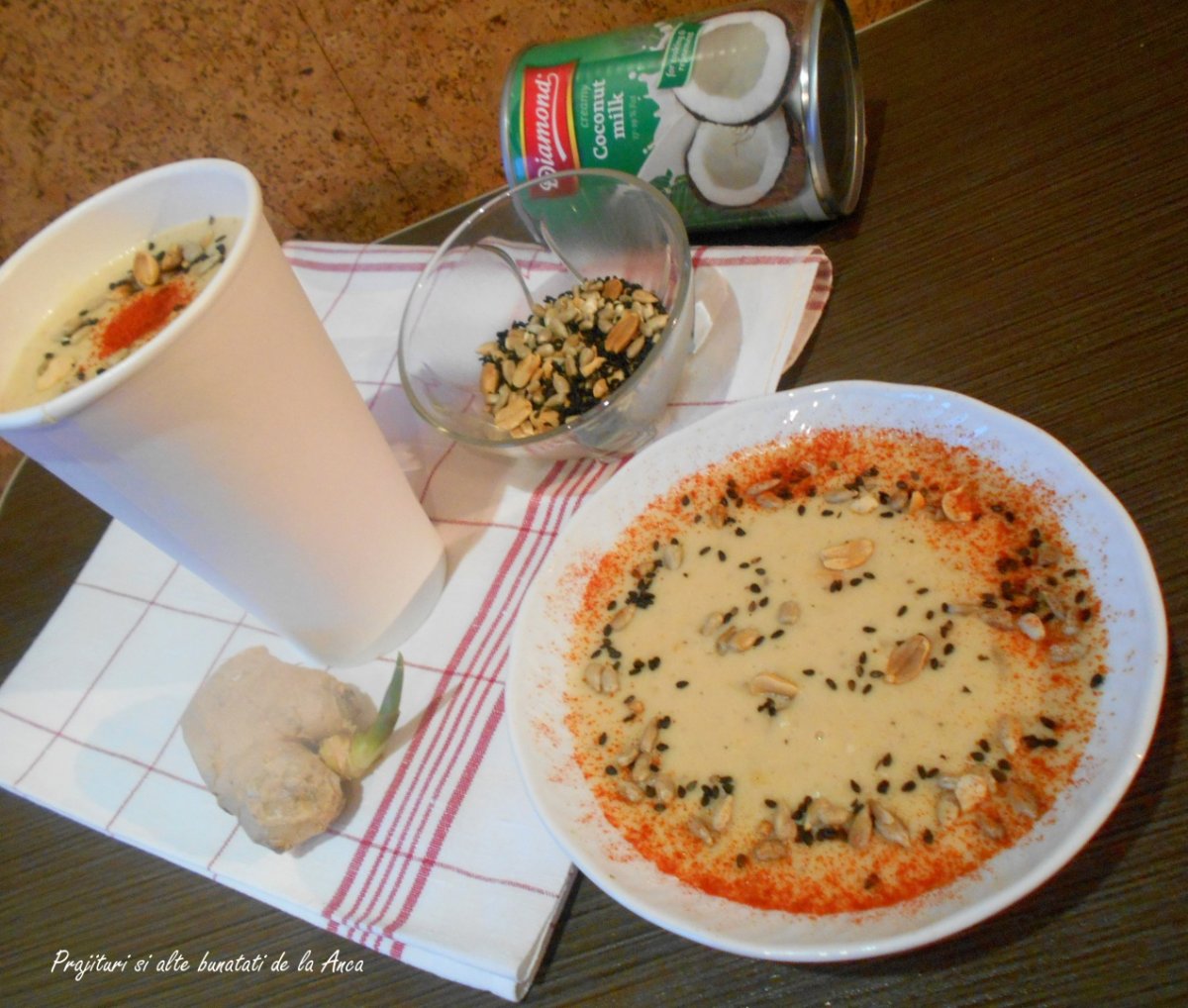 Am servit supica calda cu seminte prajite si putina boia iute pusa deasupra .