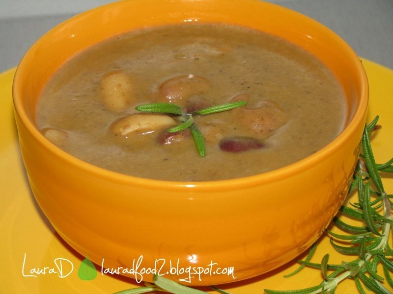 Adauga apoi lintea si lasa sa mai firba 5 minute.Inlatura cele 2 fire de rozmarin, pune compozitia din cratita intr-un blender si paseaz-o.Toarna pasta obtinuta inapoi in cratita, pe foc potrivit.Adauga amestecul de fasole si mai lasa sa fiarba 5 minute.Ia cratita de pe foc, asezoneaza dupa gust si servese.
