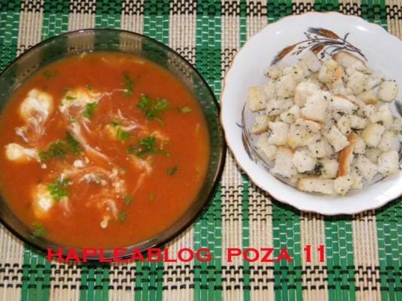 Turnăm pasta în oala în care au fiert legumele, în care a rămas supa şi adăugăm condimente. Punem la fiert, iar apoi turnăm sucul de roşii, lăsând pe foc încă 15-20 de minute. Adăugăm tăiţeii de casă şi mai lăsăm să fiarbă 10 minute. Când este gata, presărăm pătrunjelul tocat mărunt. Se serveşte cu crutoane.