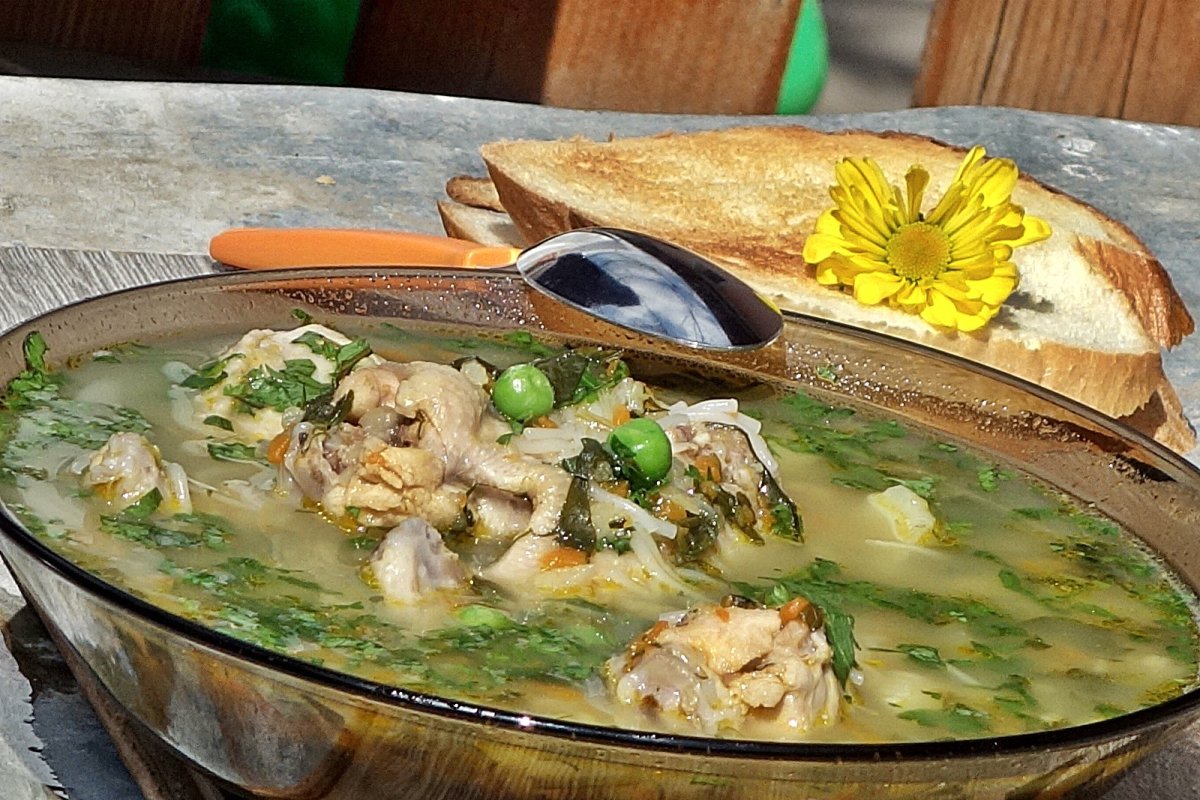 Dupa primul clocot al aripioarelor se spumeaza bine si se adauga zarzavatul maruntit la blender,mazarea boabe si cartofii cubulete.Se lasa sa fiarba cca 45 apoi se sareaza dupa gust,se adauga si boiaua dulce de ardei si se pipereaza daca se doreste,daca nu ,fiecare in farfurie.Se adauga si fideaua,se lasa sa fiarba inca 3 minute si apoi se opreste focul si se presara verdeata tocata fin.Se poate servi dulce sau un pic acrita cu suc de lamaie.