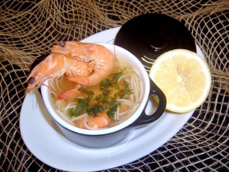 Taieteii se fierb al dente. Se scurg si se clatesc in apa rece. Supa de legume sau de pui se pune la fiert impreuna cu sosul de soia, ardeiul, sucul de lamaie si zaharul.