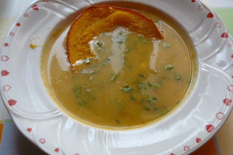 Am servit cu o bucată de dovleac pentru decor. Poţi servi şi crutoane. E o supă-cremă consumată mult în Franţa, la noi nu prea, poate ne mai schimbăm mentalitatea, e foarte hrănitoare şi sănătoasă.