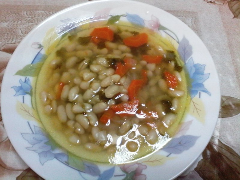 Punem fasolea la inmuiat 2-3 ore sau de pe o zi pe alta. Punem la fiert pentru 20 minute dupa care schimbam apa.Curatam, spalam si taiem ceapa , morcovii si telina. Spalam dovleceii si ii punem in blender ii facem crema. Adaugam legumele peste fasole si lasam sa fiarba la foc mediu 2- 2 1/2 ore. Servim cu zeama. De lamaie