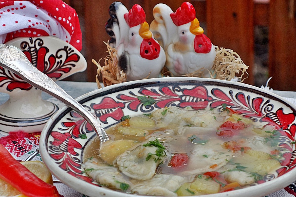 Zarzavatul curatat si spalat se taie marunt si se pune la fiert in apa cu sare.Cand legumele sunt aproape fierte adaugam si rosiile oparite si curatate de pielita si taiate cubulete,lasam sa dea in cateva clocote si apoi se adauga legumele deshidratate,un strop de ulei de masline si coltunasii si lasam sa fiarba cca 10 minute ,pana ce se ridica coltunasii la suprafata.Se opreste focul se presaram deasupra patrunjelul tocat fin.Se poate acri cu suc de lamaie,dupa preferinta fiecaruia.