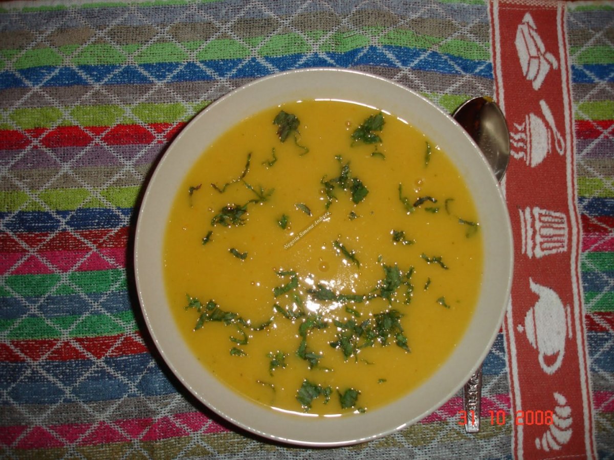 Se pune lintea la fiert si se fierbe circa 30 (la foc mic dupa ce da in fiert).Se taie ceapa, usturoiul si se rumenesc putin in uleiul de masline, dupa care se toarna peste lintea care fierbe. Se curata zarzavaturile si se toaca marunt iar apoi se adauga in oala cu linte, nu conteaza daca fierb prea mult si se sfarama. Odata cu zarzavaturile se pot adauga si mirodeniile la fiert si dupa gust se mai pot pune ierburi si la sfarsit, dupa ce se stinge focul. Cand s-a fiert lintea, se sareaza dupa gust se pune menta si se stinge focul, urmand ca toata fiertura sa se mai raceasca o vreme. Cand a ajuns la o temperatura rezonabila, se scurge zeama intr-o oala,se “arunca” toata compozitia solida in bolul de la robot si se face piure. Piureul se paseaza prin sita, ca sa se elimine cojile de la linte. Peste piureul pasat se adauga zeama si-i gata de servit. Se serveste cu zeama de lamaie. Este o supa sanatoasa si lintea rosie contine mult fier.