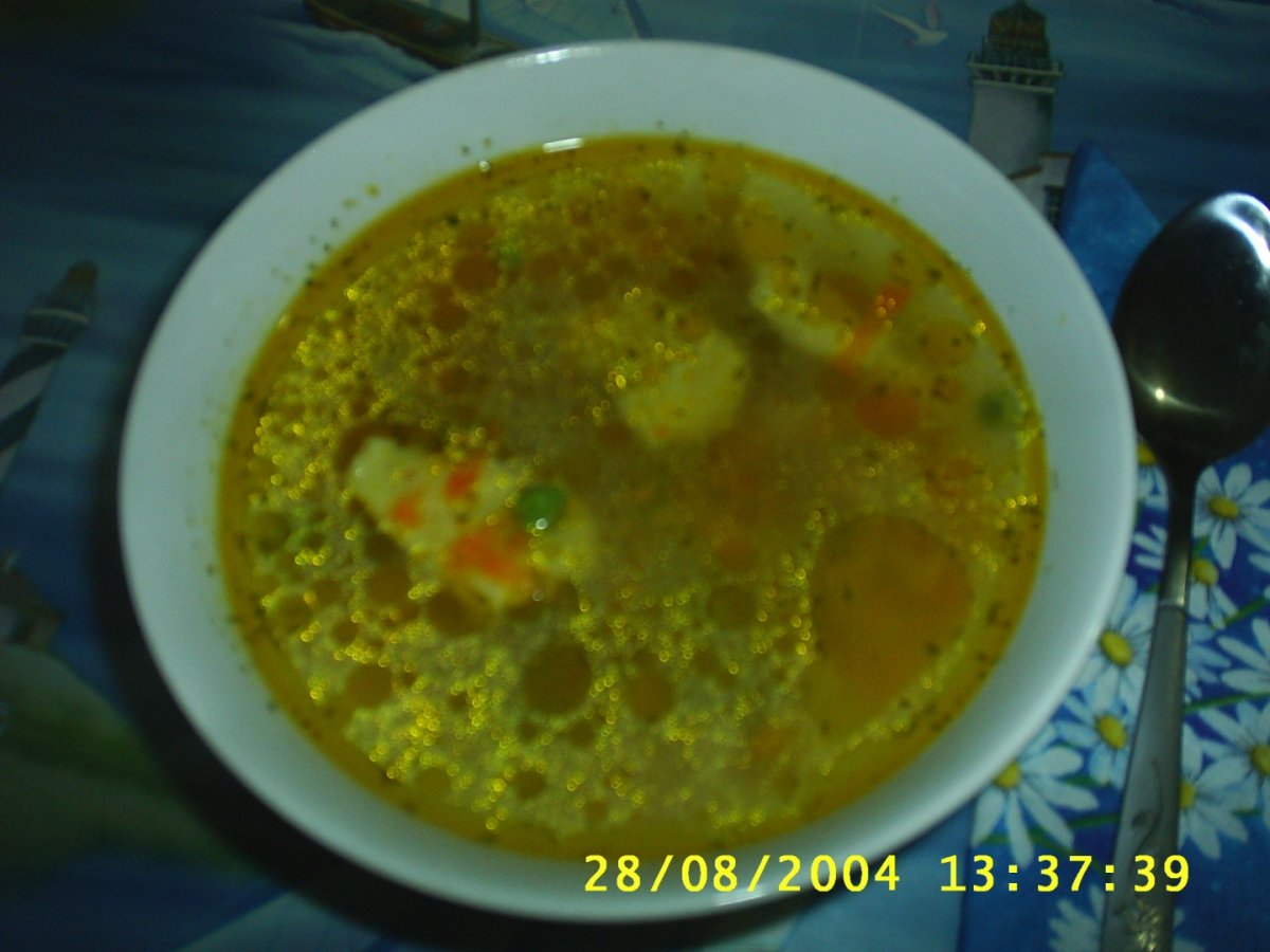 Se taie ceapa marunt,se da morcovul si telina pe razatoarea mare si se pun la calit. Dupa ce s-au calit, se adauga si mazarea si le mai lasam la calit cu ea inca 2-3 min, dupa care se adauga apa,cuburile de gaina,piper si sare, daca mai este cazul. Intre timp, facem aluatul pt galuscute: spargem oul, condimentam cu sare si piper si adaugam in ploaie faina pana se face o compozitie nu foarte tare, sa putem sa facem galuscutele .Cand este pe jumatate mazarea fiarta, se adauga galuscutele cu o lingurita mica umezita in apa. Sa aveti pofta. Puteti sa o serviti cu smantanica este foarte buna.