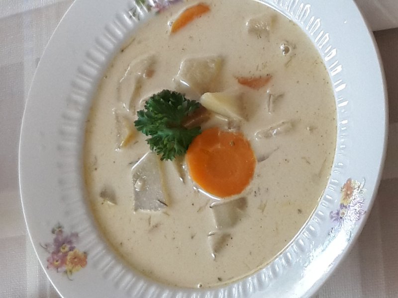 Căleşti ceapa, gulia, ţelina tăiate cubuleţe într-o lingură de ulei. Când s-au îmuiat morcovii, pui apa, sare şi piper şi laşi la fiert.
