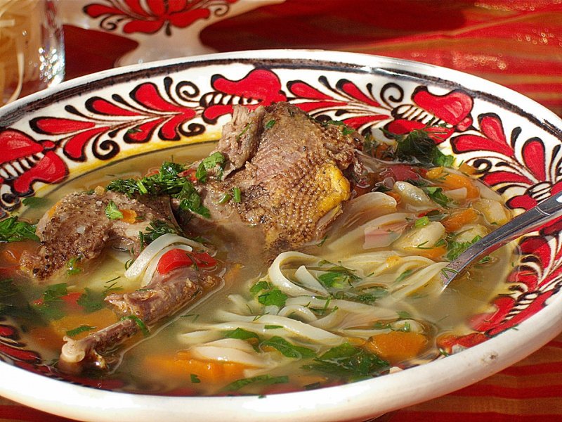 Porumbelul curatat si spalat bine se taie in 2 jumatati apoi impreuna cu maruntaiele,cu un praf de sare,boabele de piper negru si legumele deshidratate se pune la fiert cu cca 2l de apa,spumand de cate ori este nevoie de la primul clocot.Se lasa sa fiarba cca 30-45 de minute,pana se inmoaie carnea un pic apoi se aduga legumele curate si spalate.Ceapa se cresteaza in 4 ,morcovul si radacina de patrunjel se taie rondele subtiri,ardeiul se feliaza subtire,cateii de usturoi se feliaza si ei,cartofii se taie cubulete si verdeata se taie marunt.Dupa ce carnea s-a inmuiat se adauga in supa ceapa ,morcovul,radacina de patrunjel,ardeiul si usturoiul feliat.Se lasa sa fiarba cca 25 de minute,la foc potrivit apoi se adauga si cartofii,se mai lasa15 minute dupa care se adauga 2 cuiburi de taiei si se mai lasa 5 minute .Se opreste focul,se scoate ceapa si se presara verdeata deasupra.Se serveste fierbinte cu multa verdeata presarata deasupra.