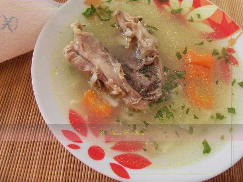 Cand incepe sa fiarba, se ia spuma. Veti sti ca e carnea fiarta cand veti observa ca incepe sa se desprinda de pe os. Se mai amesteca din cand in cand in supa, astfel incat carnea sa nu se lipeasca de oala.