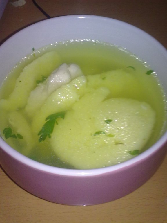 Se spala si se taie cuburi pieptul de pui si se pune la fiert impreuna cu restul de legume (morcovii, cepele, pastarnacul si telina) lasate in bucati mari, pentru ca la sfarsit se scot.Cand aproape sa dea in clocot, se pun cele doua linguri de ulei si vegeta. Se lasa sa fiarba si se spumeaza carnea. Dupa ce s-au fiert legumele, se scot din supa. Se pregateste compozitia pentru galuste: 2 oua se bat bine cu putina sare si doua linguri de ulei (nu f pline). Apoi, se adauga in ploaie cele 8 linguri de gris, amestecand f bine compozitia. Cu o lingura umezita in supa fierbinte se adauga pe rand galustele si se acopera cu un capac, lasandu-le sa dea cateva clocote. Se adauga peste ele o cana cu apa rece si iar se pune capacul si se lasa la fiert. Verificam supa de sare si la final, se adauga patrunjelul tocat marunt. Pofta buna!