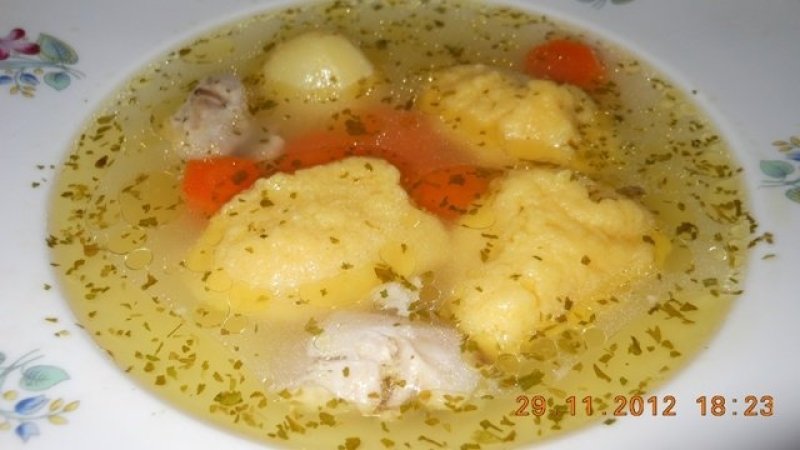 Dupa fierbere carnea si legumele se scot din supa. Morcovul se taie felii , cartofii si carnea scoasa de pe oase se pun intr-un castron. Supa se tine pe foc mic si se pune o singura galusca cu lingurita. Daca se imprastie in supa se mai adauga in compozitia de galuste o lingurita de gris. Se fierb 20 de minute la foc f mic, adaugand din 5 in 5 min cate 3 linguri de apa rece. Se intorc dupa 10 min. Se adauga carnea , rondelele de morcov si cartofii. La final se presara frunze de patrunjel tocat fin.