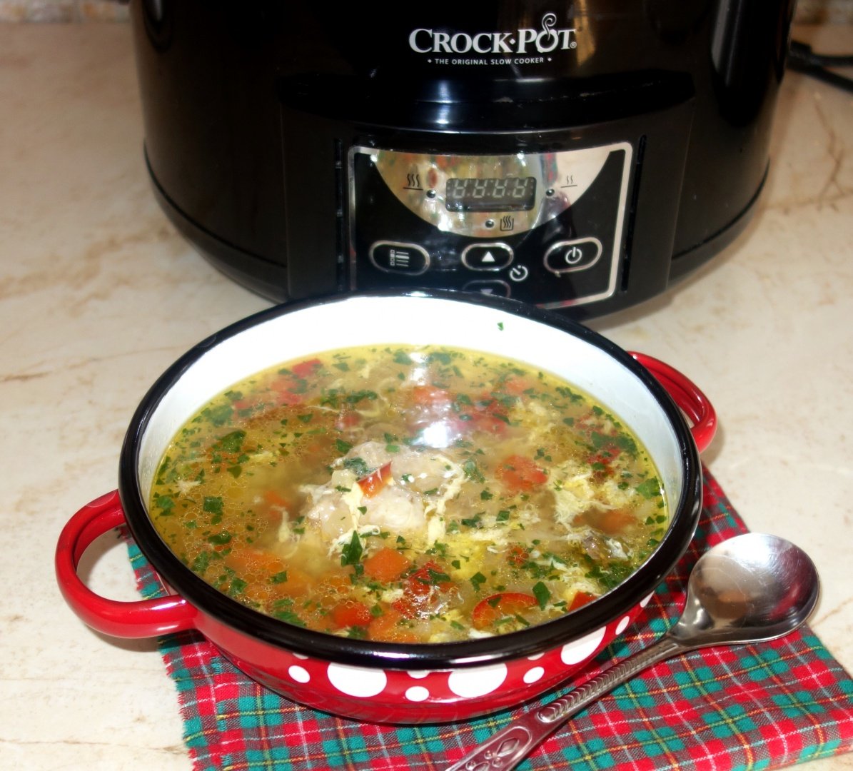 Se lasa la gatit pe functia high timp de 3 ore, apoi se bate un ou zdrente si adauga la supa. La final se adauga leustean verde tocat marunt.