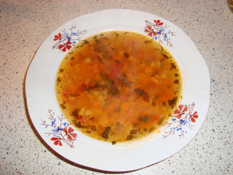 Legumele se curata, se spala si se tau cubulete marunt apoi intr-o oala se pune uleiul apoi legumele si se incalzesc putin unde apoi de pune apa si se lasa sa fiarba.Apoi se taie bucatele pieptul de pui si se aduga peste legume si se lasa sa fiarba, apoi se adauga orezul.Cand e fiert se adauga pasta de rosii,sarea, piperul, tarhonul si patrunjelul verde.