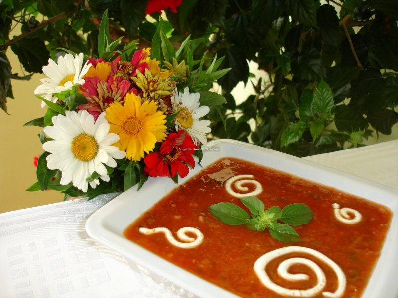 Se oparesc rosiile in acel litru de apa, se decojesc si apoi se maruntesc la robot sau se trec prin masina de tocat fiecare cum doreste (eu am dat si putina verdeata prin masina pe care am pus-o de la inceput). Morcovul se da prin razatoare pentru o culoare mai intensa a supei, ceapa, ardeiul si albitura se toaca sau se taie in sferturi. Se caleste morcovul in putin ulei dupa care se adauga si celelalte legume. Se pun in litrul de apa in care s-au oparit rosiile si se lasa la fiert. Usturoiul se piseaza cu busuiocul in mojar. Cand au fiert pe jumatate se adauga rosiile, orezul, cimbrul o mana de verdeata tocata si usturoiul. Cand au fiert toate legumele se strecoara si se mixeaza totul dupa care se adauga la supa. Se pune restul de verdeata taiata si se serveste cu smantana.