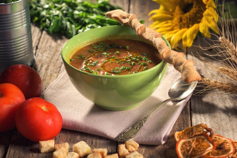 Blendati cu un blender vertical compozitia, adaugand putina zeama din cea in care au fiert legumele si nu in ultimul rand fresh-ul de portocale – supa nu trebuie sa fie nici foarte cremoasa, dar nici lichida;