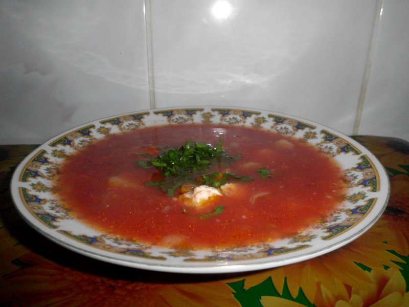-Se spala rosiile, se taie felii si se mixeaza bine,apoi se pun la fiert, separat. Cand carnea si legumele sunt fierte foarte bine, se adauga sucul de rosii obtinut si se lasa sa mai traga cateva clocote, apoi se opreste focul. Presaram cateva fire de patrunjel si leustean proaspat tocate marunut. Sa aveti pofta dragilor!
