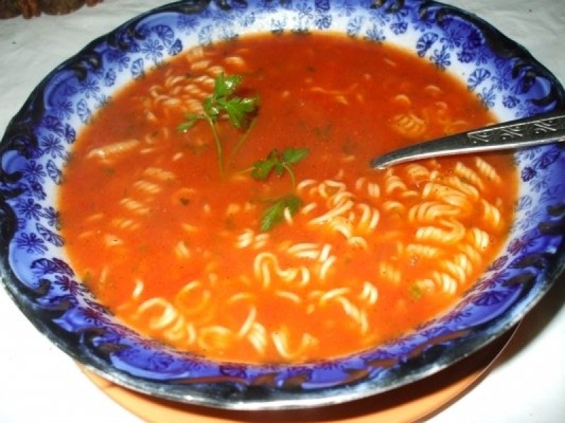 Rosiile se lasa sa se racoreasca putin apoi se mixeaza, dar nu prea mult, doar cateva miscari. (vezi video) Se strecoara de coji si seminte, se pun din nou la fiert adaugandu-se zaharul (depinde cat de dulci sunt rosiile), zeama de la pui, concentratul, putin patrunjel tocat si se drege gustul de sare si piper.