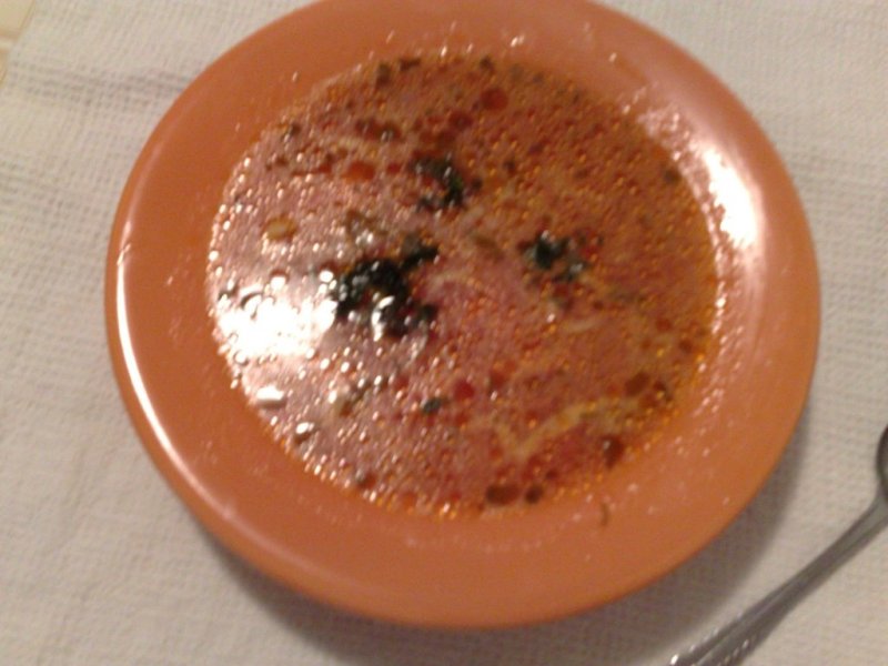 Se taie ceapa marunt,morcovii si telina se rad pe razatoarea mare se pun intr-o oala (am folosit o oala de 4 l)cu 2 linguri de ulei si se calesc 2-3 minute sa-si dezvolte aroma apoi se pune apa fierbinte pana la jumatatea oalei si se lasa sa fiarba.Cand sant aproape fierte zarzavaturile se adauga si ardeiul .In acest timp pregatim rosiile le spalam, le curatam de pielita,le dam pe razatoare si printr-o sita deasa le strecuram.Cand zarzavaturile sant fierte toate, se pune sucul de rosii,se completeaza oala daca mai trebuie cu apa, sau tot cu suc(depinde de cat de concentrata vreti sa iasa supa)se sareaza dupa gust si se mai lasa sa dea cateva clocote.Se pun taiteii direct in supa sub forma de ploaie si se amesteca sa nu se lipesca intre ei,pana cand supa incepe din nou sa fiarba in clocot.Se fierb cca 10 minute se ia oala de pe foc,oricum acestia isi vor dubla volumul.Pentru aroma se pun patrunjel proaspat si telina frunze tocate marunt