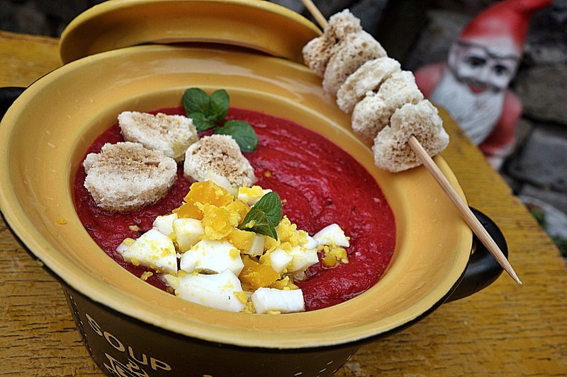 Se mixeaza totul cu un strop de ulei de masline si cu menta taiata, adaugam apa daca mai este nevoie, pentru consistenta pe care o dorim. Se serveste cu ouale taiate cubulete si presarate deasupra si cu crutoane de paine.