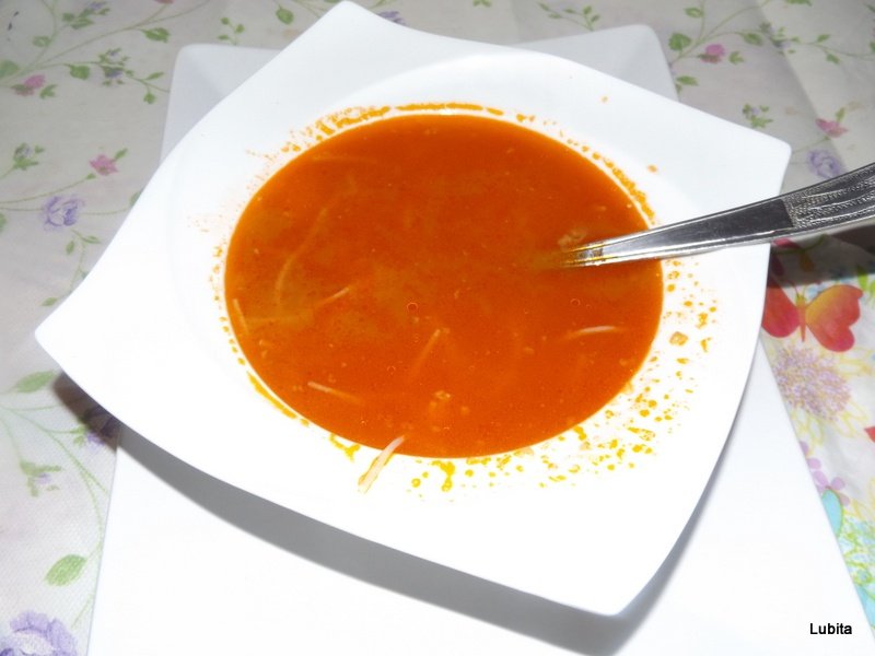 Oasele de vita spalate,se pun in oala sa fiarba iar daca dupa 30-40min se aduna deasupra spuma neagra,se arunca apa,oasele se spala si se pun din nou la fiert,impreuna cu 1lingura rasa cu sare;cand incepe sa clocoteasca se adauga legumele curatate,spalate si taiate in jumatati.Dupa 2h de fiert incet,se strecoara totul,oasele se dau deoparte,legumele se paseaza cu blenderul vertical,piureul obtinut se amesteca cu zeama de la fiert,se mai adauga 1cana cu apa daca e nevoie,se potriveste la gust,cand incepe sa clocoteasca se adauga pastele iar dupa 3-4min se opreste focul si se serveste.