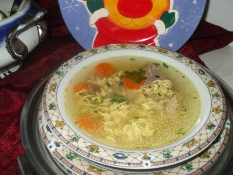 Se pune la fiert, la foc mic, in 4 litri de apa rece cu putina sare carnea de curcan. Cand clocoteste se ia spuma si se lasa sa fiarba cam 40 minute, apoi se pun cepele, morcovii, pastarnacul intregi, concentratul si zaharul. Se lasa sa mai fiarba, la foc mic cu capac, inca 20-25 minute. Se drege gustul de sare.