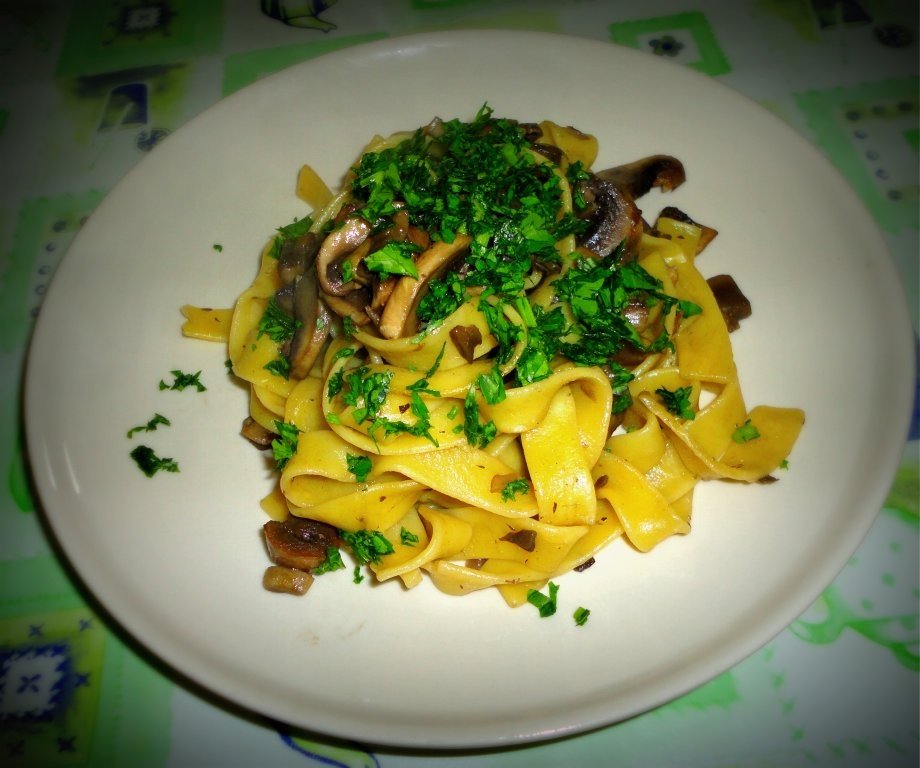 Intre timp fierbem pastele in apa sarata si le lasam conform instructiunilor de pe ambalaj. Eu prefer sa termin fierberea lor in sosul de ciuperci si deci opresc pastele cu 2 minute mai devreme, le scurg si le pun peste ciuperci, adaug un polonic din apa in care au fost fierte si le las sa se faca, daca le preferati mai 'al dente', le lasati mai putin. Fac acest lucru deoarece aromele de amesteca mai bine.