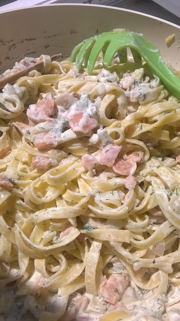 Intr-o tigaie se incinge ulei si se caleste ceapa. Se adauga crema de branza si se amesteca. Treptat se adauga apa in care au fiert pastele pana se obtine un sos cremos. Se adauga somonul, sare, piper, marar si tagliatellele fierte. Se amesteca pana se acopera pastele bine.