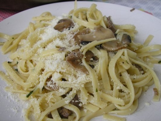 Intr-o tigaie incinsa cu putin ulei prajim patrunjelul si usturoiul in prealabil tocat marunt. Dupa cateva minute adaugam ciupercile taiate, sare si acoperim cu un capac. Cand ciupercile au lasat toata apa descoperim tigaia si mai fierbem pentru cateva minute. Intre timp fierbem taietei si cand sunt gata ii adaugam in tigaia cu sosul de ciuperci. Amestecam totul bine si pastele noatre sunt bune sa fie gustate. Cine prefera se poate adauga un strop de parmezan.