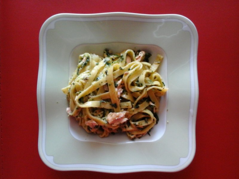 Dupa ce s-au fiert taiteii, se scurg si se pun peste spanac, apoi se adauga si bucatelele de somon.