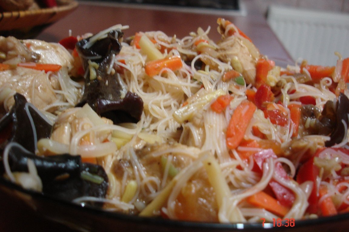 In primul rand am pus apa la fiert pentru taiteii de orez. Cubuletele de pui le-am dat prin amidon apoi le-am pus intr-un castronel apoi am adaugat peste ele ghimbirul ras, sosul de soia si praful de usturoi.Le-am lasat sa stea 15 minute la marinat. Sincer nu am un wok dar intr-o tigaie ceva mai inalta am incins putin ulei in care am rumenit carnea de pui. Inainte sa fie complet gatita am adaugat legumele congelate si ciupercile (tinute in apa fiarta vreo 5 minute).Taiteii se fac foarte repede asa ca i-am pus in apa fiarta pentru doar 2 minute.I-am scos din apa fiarta si i-am adaugat peste carne si legume. Am mai amestecat 1 minute toate ingredientele cu cel 2 lingurite de sos de soia si am servit cald.