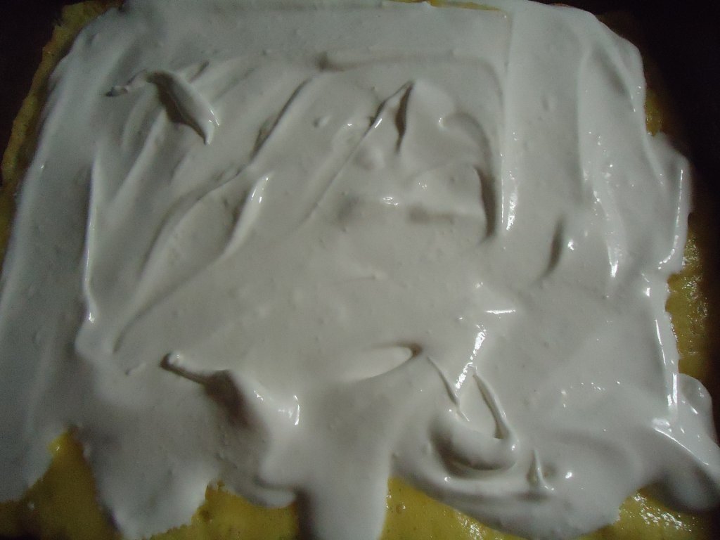 Incorporam:galbenusurile cu zaharul, smantana,faina,aromele si praful de copt. Asezm aluatul in tava unsa cu unt,tapetata cu faina.Asezam fructele si dam la cuptor. Cand se formeaza o crusta peste fruucte, se adauga bezeaua obtinuta prin baterea albusurilor cu zaharul, un varf de cutit de sare si zeama de lamaie.