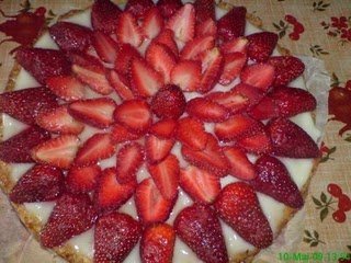 Dupa ce sa racit blatul adaugam crema de vanilie; ornam cu capsuni si turnam de asupra gelatina care a fost preparata astfel: peste pachetul de gelatina turnam 100 ml apa si lasam 10 min sa stea, apoi pe baie de abur topim gelatina.