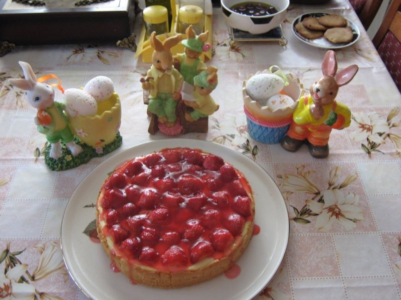 Se decoreaza cu jumatatile de capsuni peste care se toarna glazura.