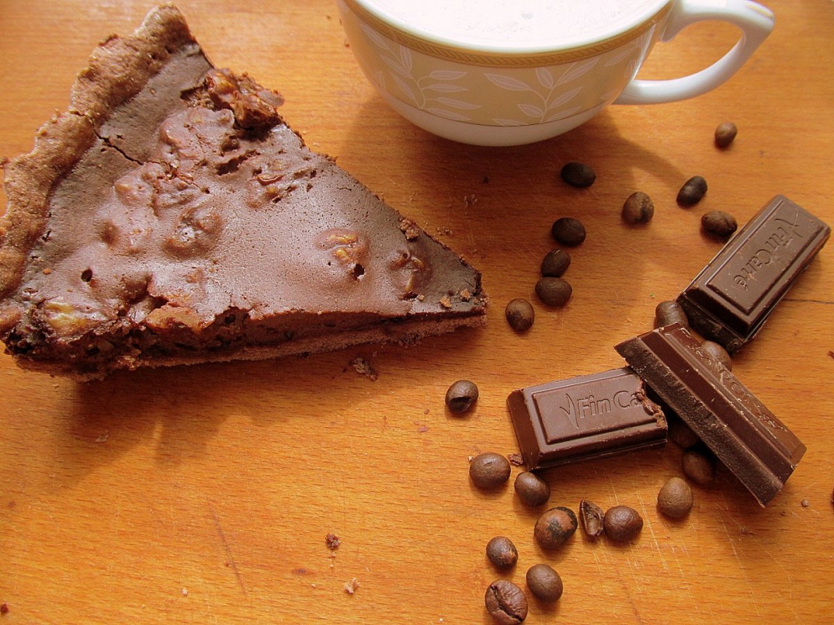 Peste aluatul de tartă uns cu albușul de ou se adăugă nucile. Peste acestea se adaugă compoziția de ciocolată.
