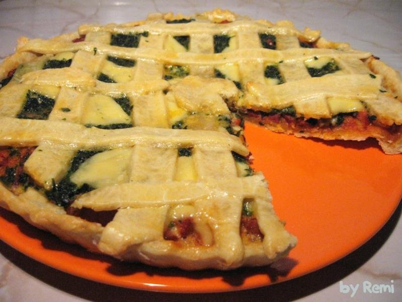 După ce au trecut cele 10 minute am pus în cocă umplutura în felul următor: un strat din carnea cu sos, un strat de spanac, feliile de brânză topită rupte în cîteva bucăţi. Apoi am pus deasupra lor grilajul făcut din aluatul rămas, am uns totul cu un ou şi am dat la cuptor pentru vreo 20-25 minute.