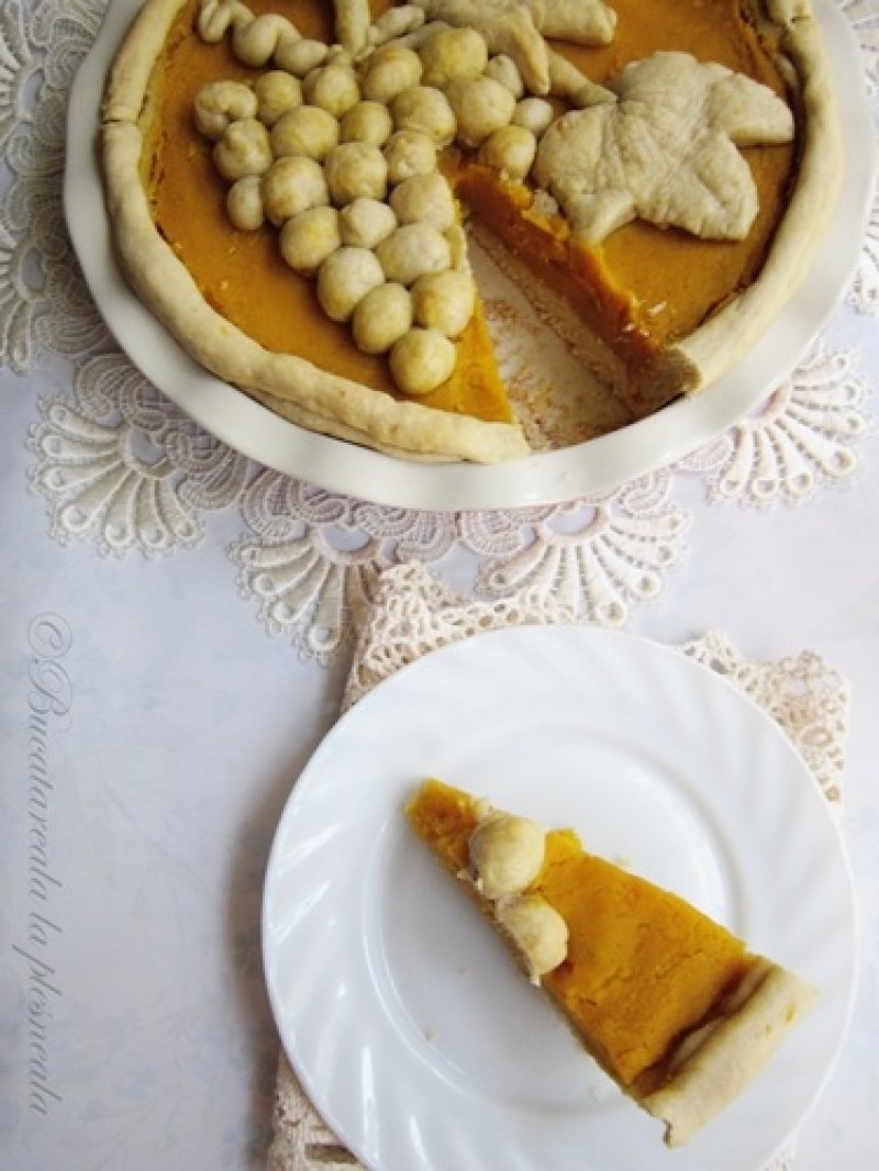 2. Taiem dovleacul in sferturi si il curatam de seminte. Il punem intr-o tava tapetata cu hartie de copt, il presaram cu 50 g zahar brun si il introducem in cuptor cam 30-45 min. Il verificam, daca s-a copt il putem scoate. (Cat e dovleacul in cuptor ne putem ocupa de aluat)