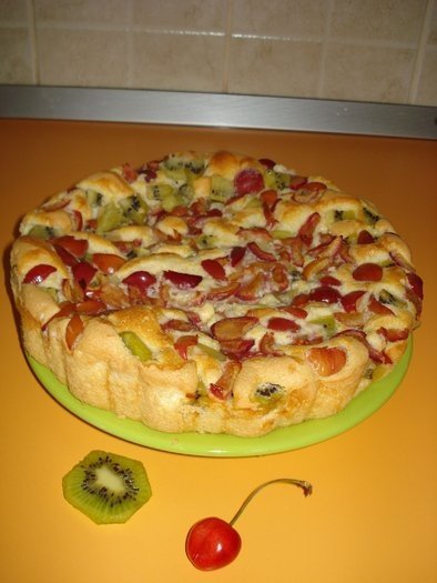 Turnam compozitia intr-o tava unsa cu ulei si tapetata cu faina.Asezam fructele,care initial le-am dat putin prin faina,pe toata suprafata prajiturii.Punem tava la cuptor 25 de minute,la foc mic!!!