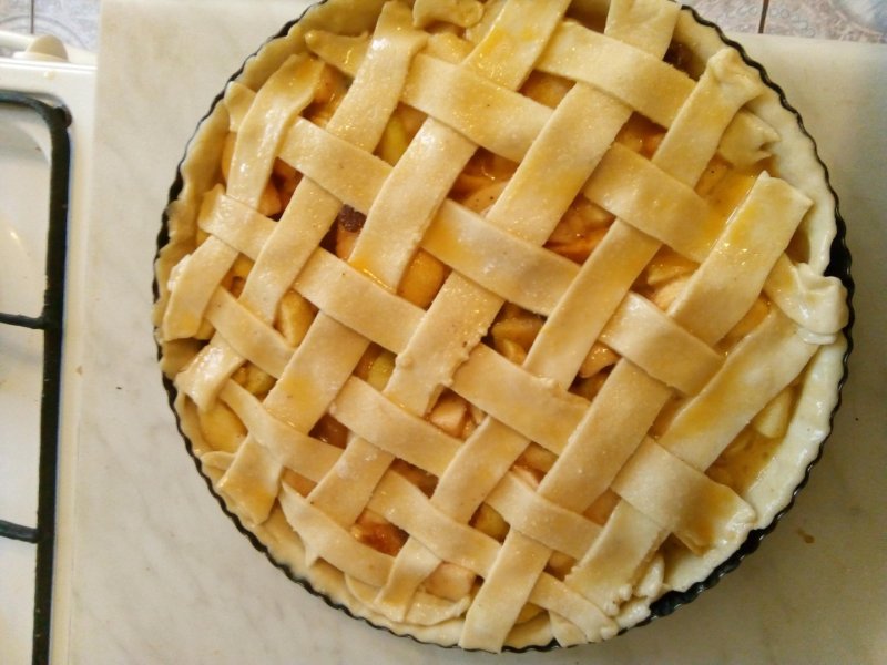 Se face un aluat, se tine la rece, apoi se împarte în două bucăți inegale, se întinde o foaie mare in tava unsa cu unt, se așază fructele, se aranjează fâșii din aluat întins.